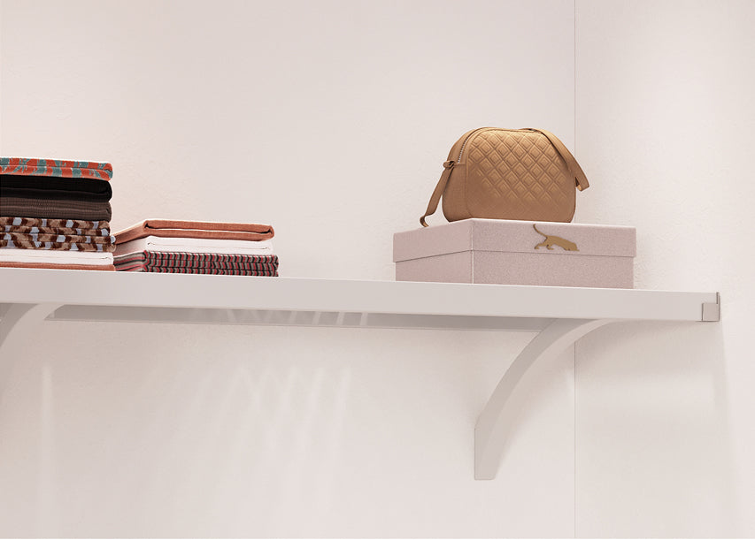 Our solid wood contemporary curved designed angle brackets provide underside shelf support and allow for free hanging shelves. Allowing you to utilize and place our solid wood shelving in spaces outside of just the closet. Whether it’s shelving for books, family pictures, or toys for your kids, our angle bracket hardware beautifully adapts our shelving to any space in any room.
