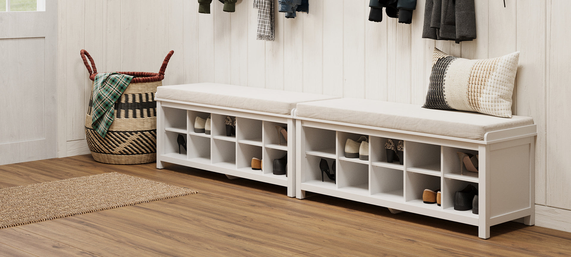 Beyond being a fantastic entryway bench, you'll discover its incredible customization and functionality as it seamlessly transforms into end-of-bed seating, walk-in closet seating, a room accent, or even part of a hall tree system. Enjoy a beautifully organized home that reflects your sophisticated style, thanks to this durable and versatile shoe storage solution.